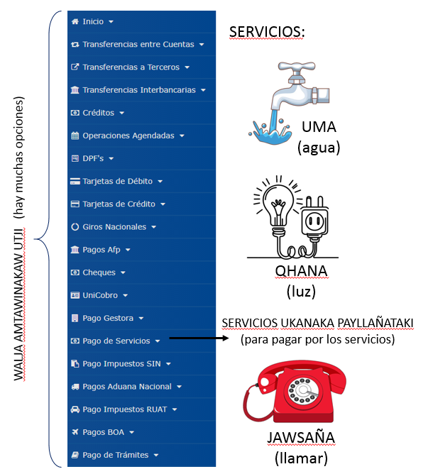 WALJA AMTAWINAK TAYPINXA, SERVICIOS UKANAKAT QULLQI CHURAÑ THAQHAÑA (entre muchas opciones, buscar pago por servicios).