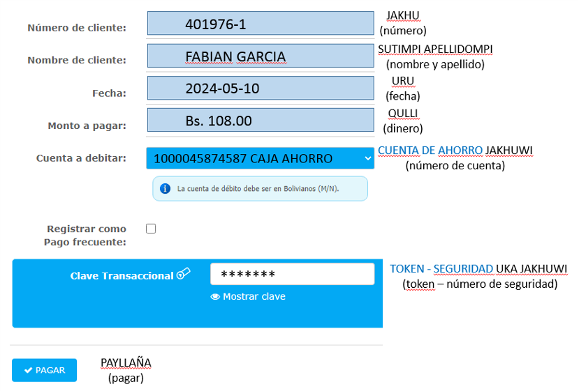 2. BANCOX JANIPUNIW CORREO TUQI JAN UKAX TELÉFONO TUQI YATIYAWINAKAM MAYIPKANITI, ESTAFADORES [SALLQJIRI JAQI - persona engañosa] UKANAKAX BANCO UKHAM UÑT’AYASIPXI YATIYAWINAK MAYIÑATAKI (el banco nunca te pedirá tus datos por correo o por teléfono, los estafadores se hacen pasar por un banco para pedir tus datos).